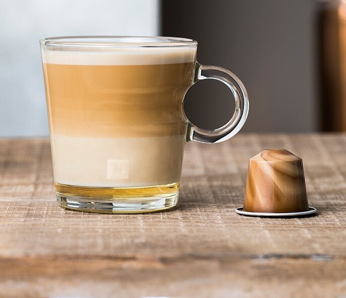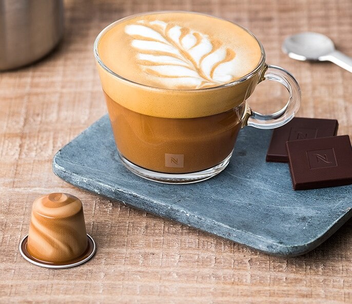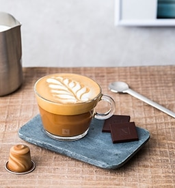 • Déposez 2 carrés de chocolat noir aux éclats de caramel salé Nespresso au fond d’une tasse View Cappuccino.